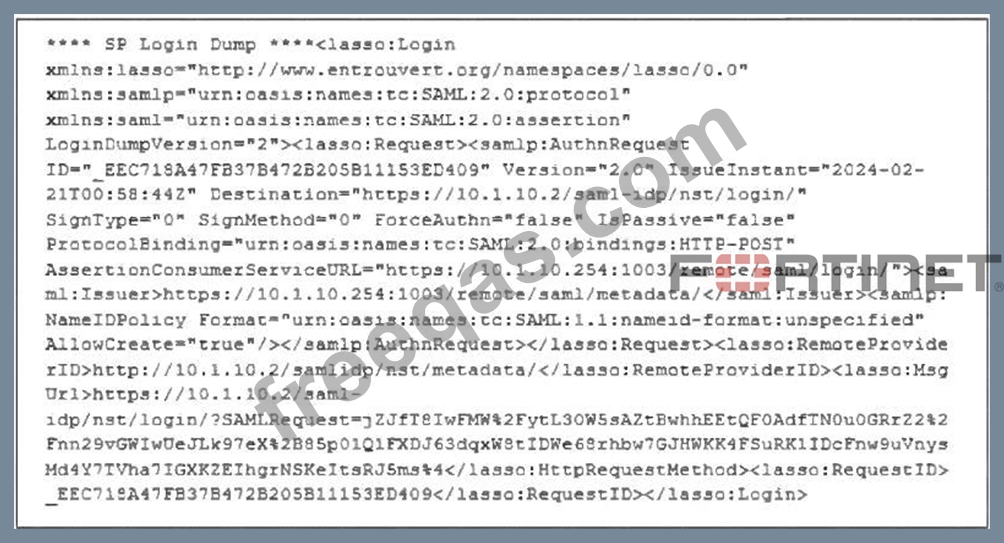The exhibit shows the output from using the command diagnose debug application samld -1 to diagnose a SAML connection.