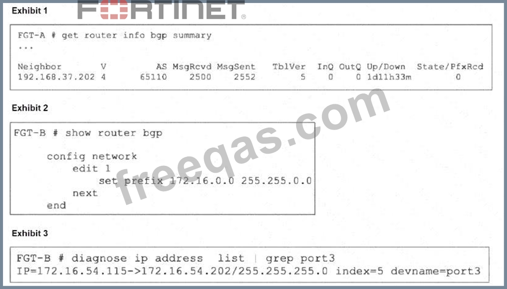 An administrator is attempting to advertise the network configured on port3. However, FGT-A is not receiving the prefix.