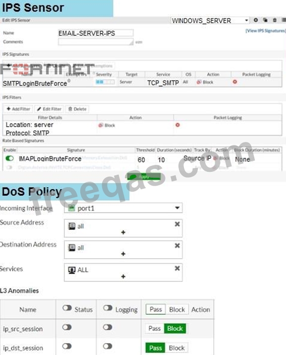 Examine the IPS sensor and DoS policy configuration shown in the exhibit, then answer the question below.