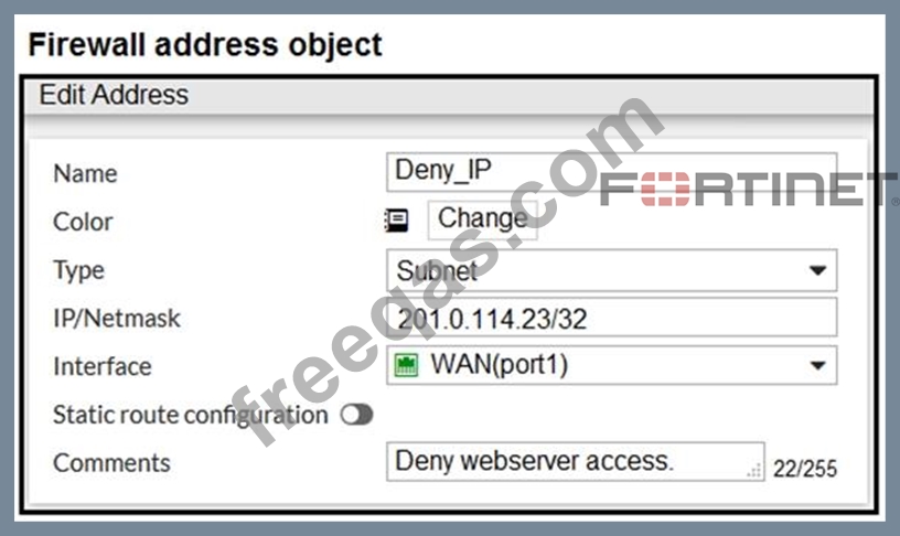 The exhibit contains a network diagram, firewall policies, and a firewall address object configuration.