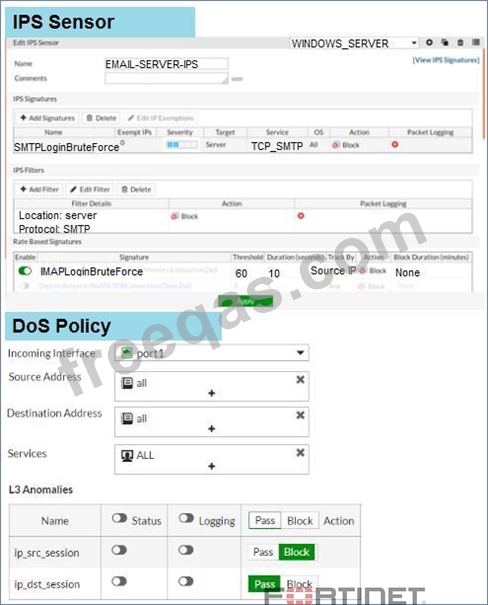 Examine the IPS sensor and DoS policy configuration shown in the exhibit, then answer the question below.