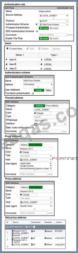 The exhibit shows proxy policies and proxy addresses, the authentication rule and authentication scheme, users, and firewall address.
