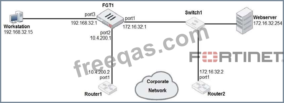 Which one of the following routes is the best candidate route for FGT1 to route traffic from the Workstation to the Web server?