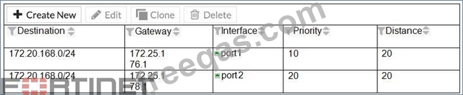 Which of the following is the expected FortiGate behavior regarding these two routes to the same destination?