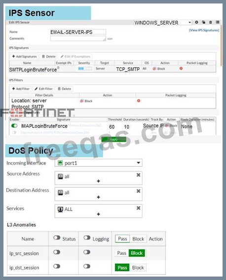 Examine the IPS sensor and DoS policy configuration shown in the exhibit, then answer the question below.