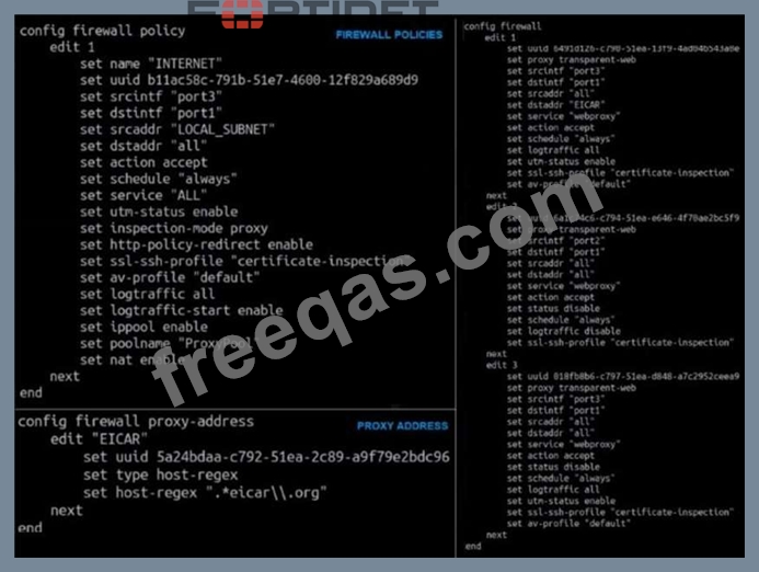 The exhibit shows a CLI output of firewall policies, proxy policies, and proxy addresses.
