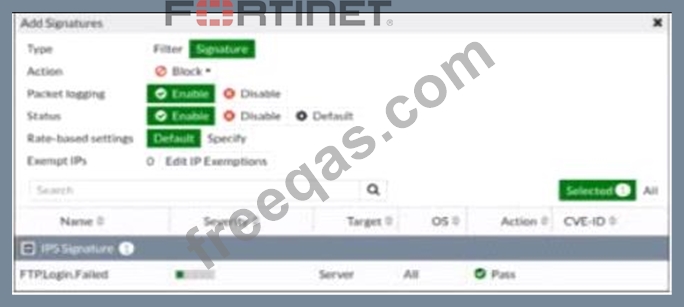 Review the Intrusion Prevention System (IPS) profile signature settings. Which statement is correct in adding the FTP.Login.Failed signature to the IPS sensor profile?
