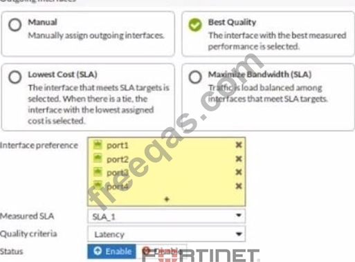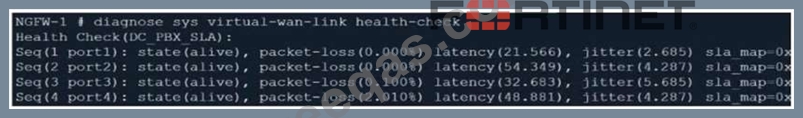 The exhibit contains the configuration for an SD-WAN Performance SLA, as well as the output of diagnose sys virtual-wan-link health-check.