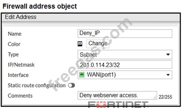 The exhibit contains a network diagram, firewall policies, and a firewall address object configuration.