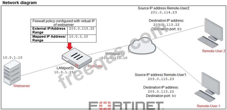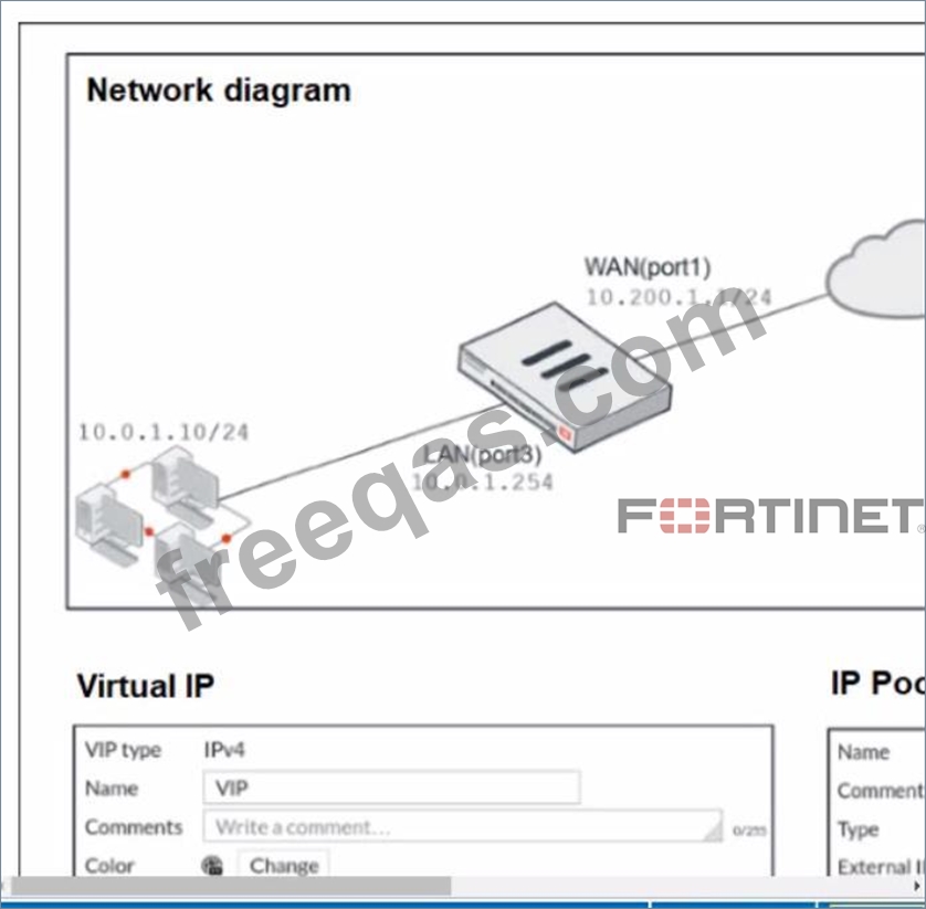 The exhibit contains a network diagram, virtual IP, IP pool, and firewall policies configuration.