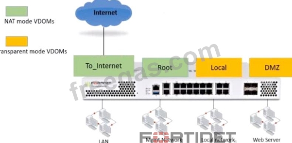 The Root and To_Internet VDOMs are configured in NAT mode. The DMZ and Local VDOMs are configured in transparent mode.