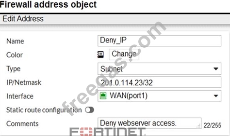 The exhibit contains a network diagram, firewall policies, and a firewall address object configuration.