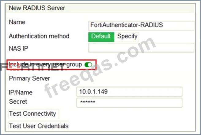 An administrator added a configuration for a new RADIUS server. While configuring, the administrator selected the Include in every user group option.