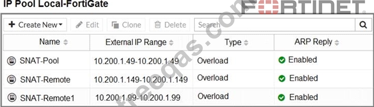 The exhibit contains a network diagram, central SNAT policy, and IP pool configuration.