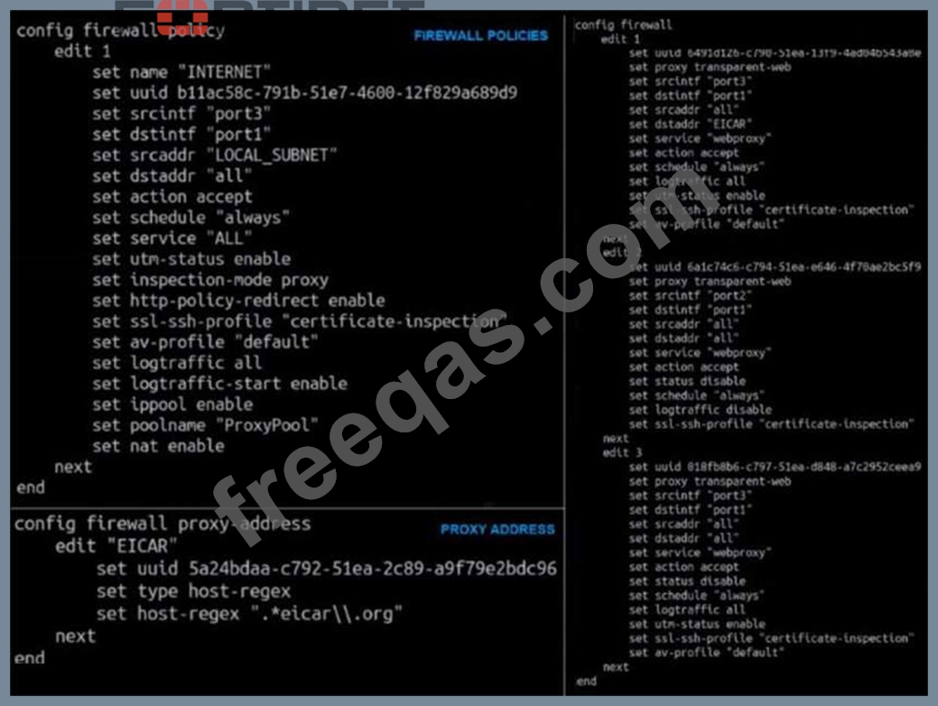 The exhibit shows a CLI output of firewall policies, proxy policies, and proxy addresses.