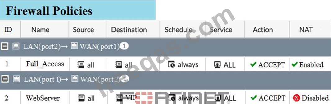 The first firewall policy has NAT enabled on the outgoing interface address. The second firewall policy is configured with a VIP as the destination address.