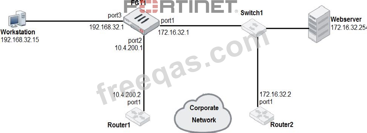 Which one of the following routes is the best candidate route for FGT1 to route traffic from the Workstation to the Web server?
