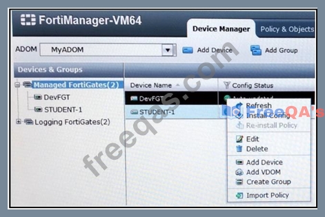 A user selects Install Config for a managed FortiGate device, as shown in the exhibit.