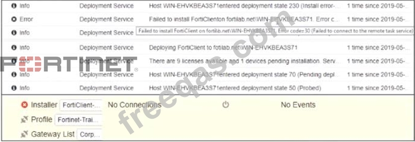 Based on the logs shown in the exhibit, why did FortiClient EMS fail to install FortiClient on the endpoint?
