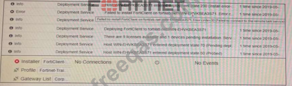 Based on the logs shown in the exhibit, why did FortiClient EMS fail to install FortiClient on the endpoint?