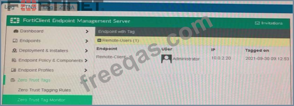 Remote-Client is tagged as Remote-Users on the FortiClient EMS Zero Trust Tag Monitor.