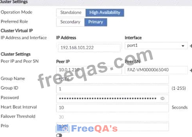 The image displays "he configuration of a FortiAnalyzer the administrator wants to join to an existing HA cluster.