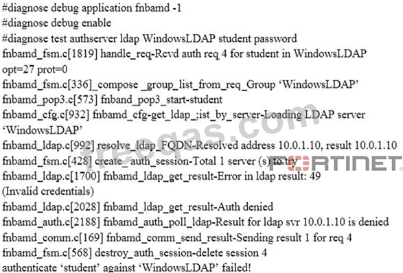 The LDAP user student cannot authenticate. The exhibit shows the output of the authentication real time debug while testing the student account: