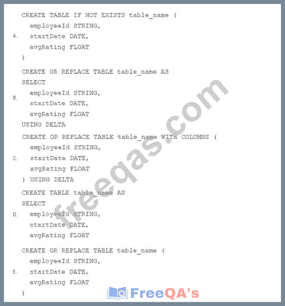 Which of the following code blocks uses SQL DDL commands to create an empty Delta table in the above format regardless of whether a table already exists with this name?