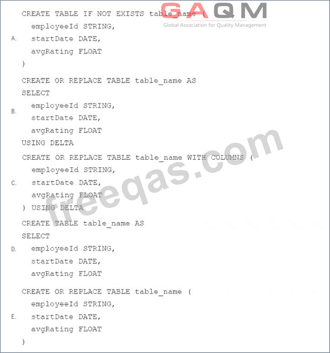 Which of the following code blocks uses SQL DDL commands to create an empty Delta table in the above format regardless of whether a table already exists with this name?