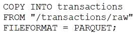 A data engineer runs a statement every day to copy the previous day's sales into the table transactions. Each day's sales are in their own file in the location "/transactions/raw".