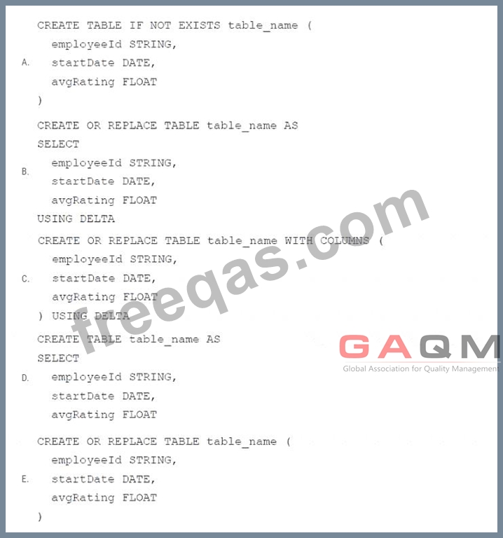 Which of the following code blocks uses SQL DDL commands to create an empty Delta table in the above format regardless of whether a table already exists with this name?