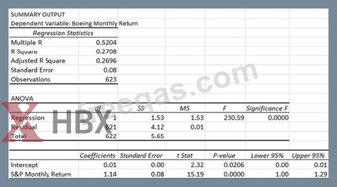 In finance, beta is a measure of the systematic risk of a security in comparison to the market as a whole. Beta can be found by running a regression analysis of the monthly returns of the security versus the monthly returns of the general market. The regression output table below shows the relationship between Boeing's monthly returns and the monthly returns of the Standard and Poor's 500 (S&P 500) which is a stock market index of 500 large companies.