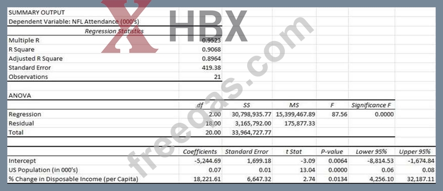 A group of season ticket holders wants to forecast what the total attendance at National Football League (NFL) games will be next season. A study by the US Census Bureau predicts that the total US population next year will be 310.738 million and the percent change in disposable income per capita will be 1.0%.