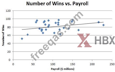 The scatterplot below shows the relationship between the number of wins for 30 Major League Baseball teams in 2013 and their respective payrolls. The best fit line is included in the scatterplot. Which option below MOST accurately describes the best fit line shown?