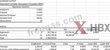 A student wants to analyze the relationship between the percentage of the population in a given city with some college experience and the newspaper circulation in that city. College experience is defined as the percentage of adults in the city that have completed high school and taken some classes at the college level. The appropriate data were collected and a regression analysis was performed, the results of which are displayed below.