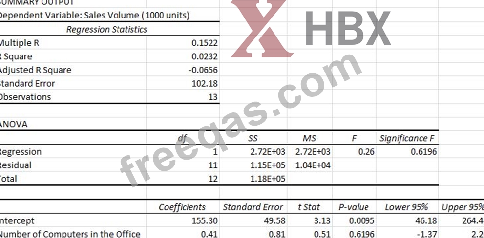 A company manager commissions a report to study the relationship between sales volume (in thousands of units) and the number of computers in each of the company's offices. Based on the regression output, which of the following statements is correct?