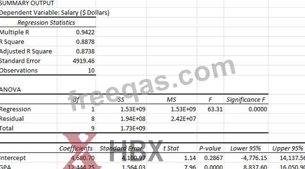 A student gathers information and performs a regression analysis comparing a person's undergraduate GPA to that person's starting salary after college graduation.