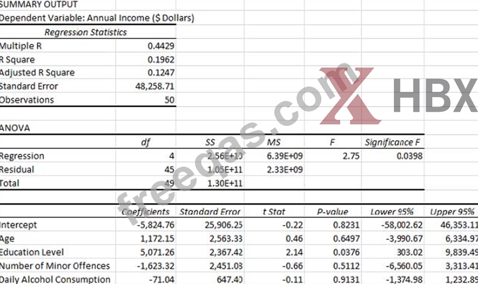 A study was conducted to examine the effect of age, education level, number of minor legal offences, and daily alcohol consumption on annual income.