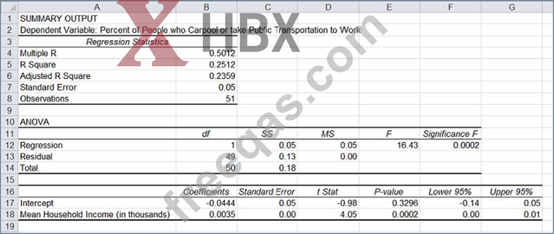 A city planner believes that as people's income rises, they are less likely to travel to work using public transportation or carpools. To see whether this belief is substantiated, the city planner gathers data from the 50 U.S. states on mean household income (in thousands of dollars) as well as the percent of people who take public transportation or carpool to work. The results for this regression are given below.
