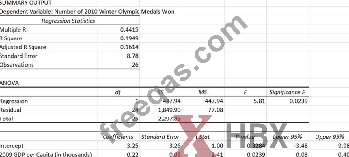A journalist believes that it is possible to predict the number of Winter Olympic medals a country will win by analyzing the country's gross domestic product (GDP) per capita in the year prior to the Olympics. The journalist collects data on the 26 countries that won medals at the 2010 Winter Olympics and performs a regression analysis. The results for this regression are provided below.