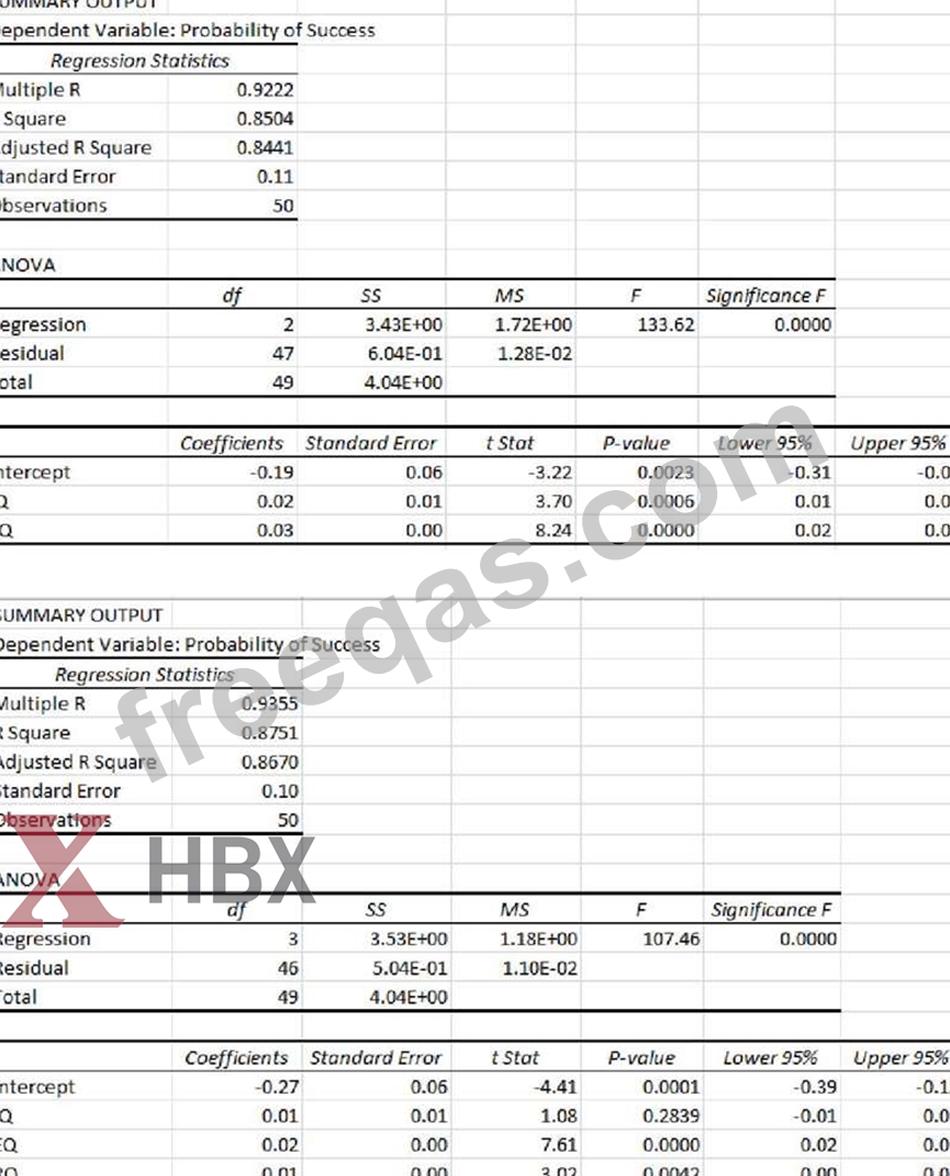 Based on the two regressions outputs below, does adding the RQ component help forecast the probability of being successful at work?