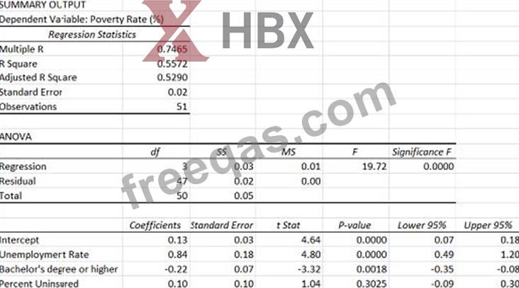 The student collects data from each of the 50 states in the U.S. and Washington D.C. for the year 2012 and runs the regression in Excel. The results of this regression are given below. Based on these results, what does the model predict the poverty rate would be for a state for which the unemployment rate is 6%, 20% of all adults over 25 have at least a bachelor's degree, and 5% of the population does not have health insurance?