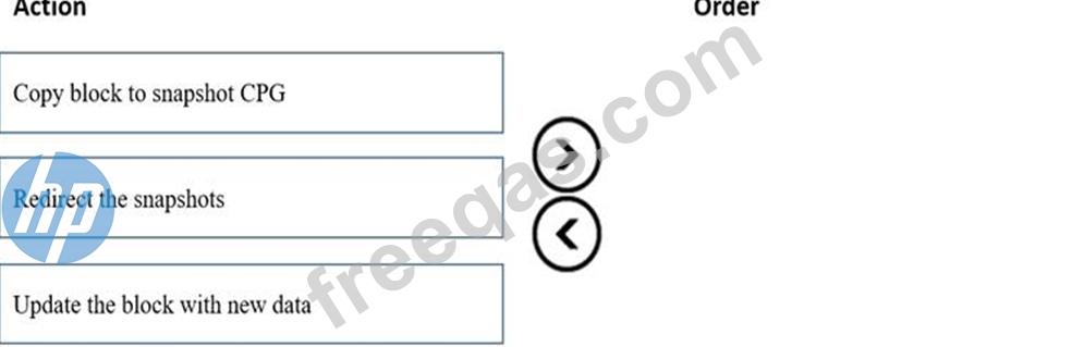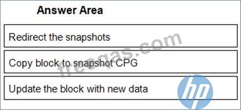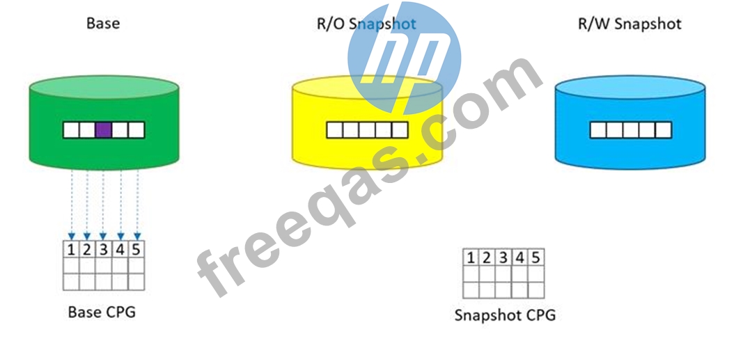 You create two snapshots of a thin provisioned base volume in an HPE Primer a. One snapshot is read only and the other is read-write. A write occurs at the location shown in in the diagram.