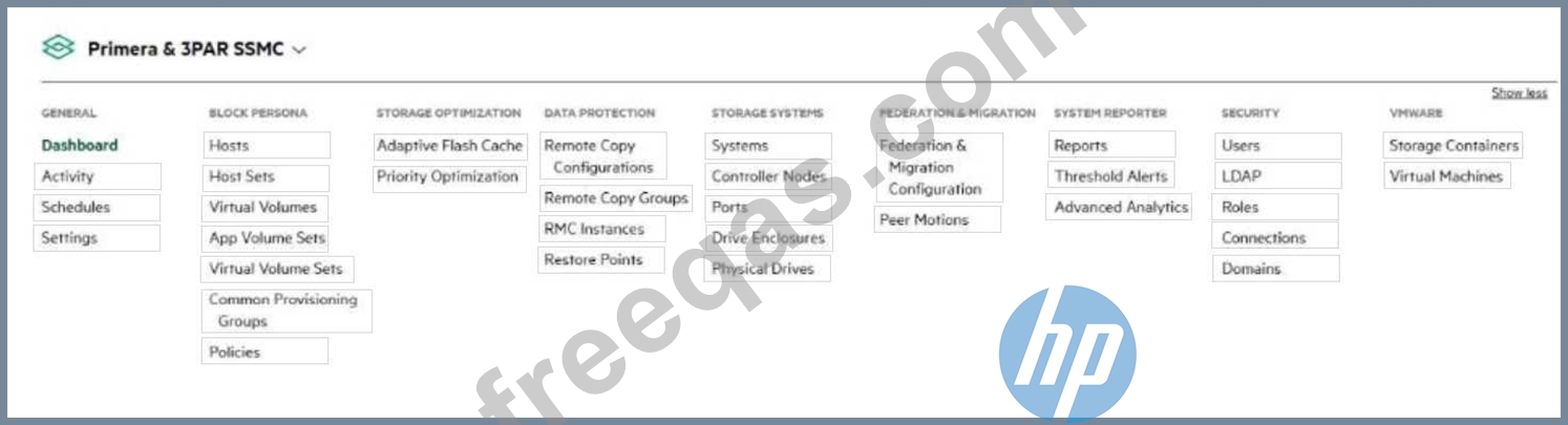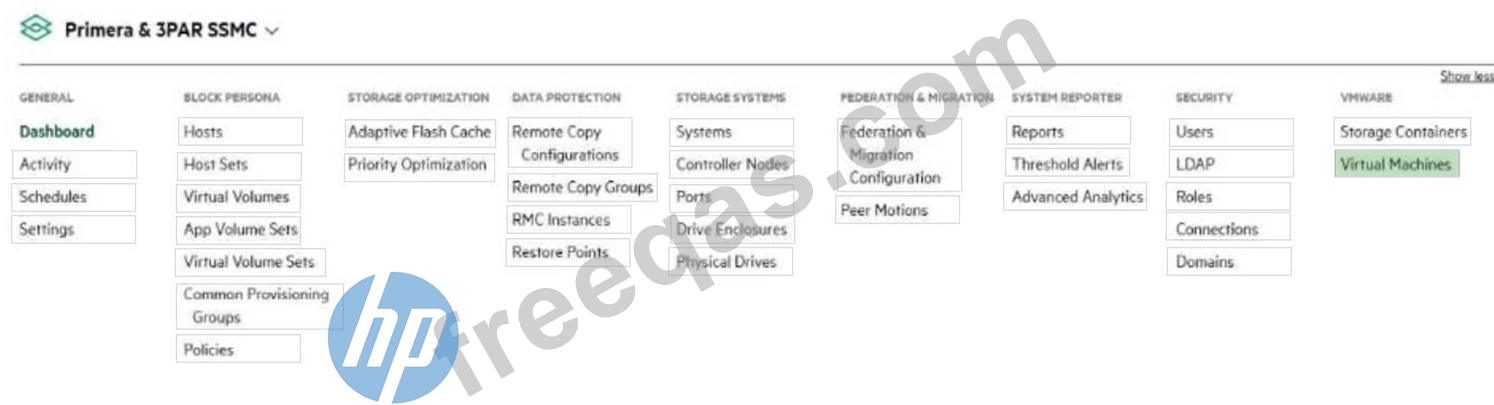 You configured a virtual machine cluster using the HPE Storage Integration Pack for VMware vCenter. Click the option in the SSMC main menu that you can use to verify whether a virtual storage operation is properly created on HPE Primera or 3PAR.