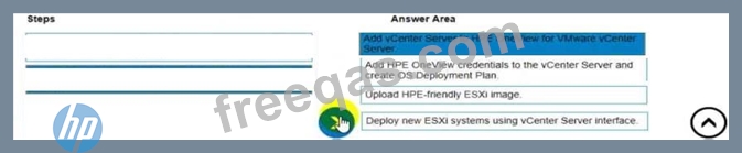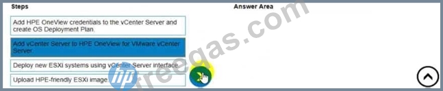 They created a server profile template that they want to use in HPE OneView. Put the steps required to configure HPE OneView for VMware vCenter Server on the left into their correct order on the right.