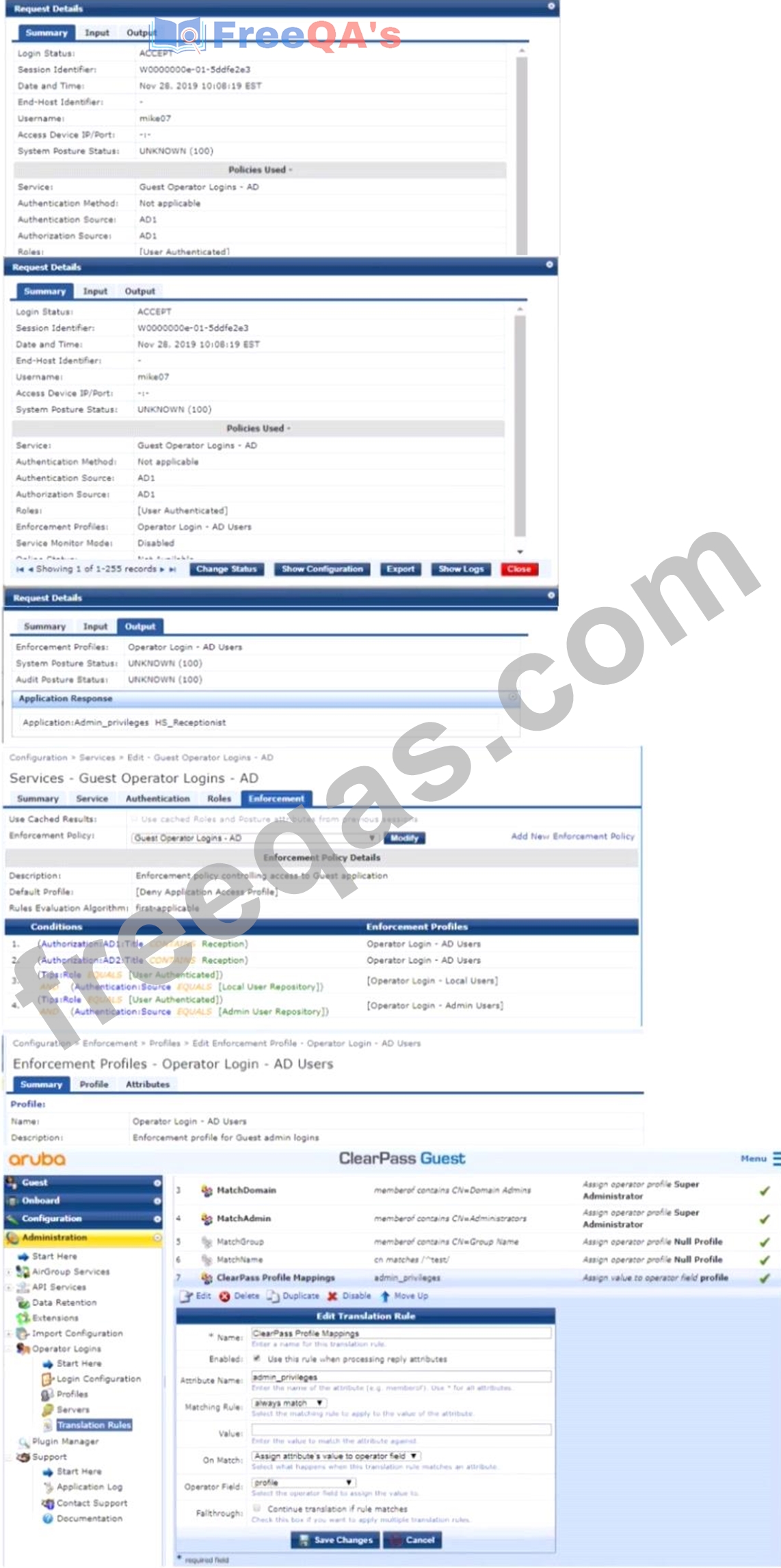 The customer configured a guest operator access by creating a custom operator profile and the built-in universal ClearPass profile mapping translation rule. When he tests the setup, he gets authentication failed. Using the streenshots sent by the customer as a reference, what would suggest to the customer to fix the issue?