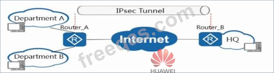 As shown in the figure, Department A of Branch 1 can access the Internet, and Department B can access headquarters resources only through the encrypted VPN. You can configure a NAT policy on the egress device in Branch 1 to allow Department A to still access the Internet, and configure an IPsec VPN (ESP protocol) in tunnel mode for Department B to allow Department B to access the headquarters.