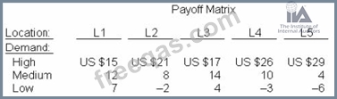 A bank plans to open a branch in one of five locations (labeled L1, L2, L3, L4, L5). Demand for bank services may be high, medium, or low at each of these locations. Profits for each location-demand combination are presented in the payoff matrix.