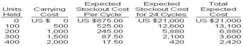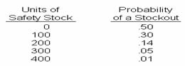 Each stock out of a product sold by Company I-: costs US $1,750 per occurrence. The carrying cost per unit of inventory is US $5 per year, and the company orders 1,500 units of product 24 times a year at a cost of US $100 per order. The probability of a stock out at various levels of safety stock is.