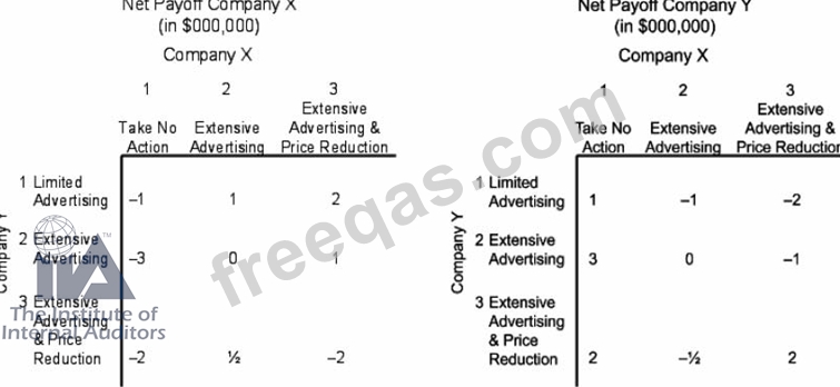 Your company (Company Y) has decided to enter the European market with one of its products and is now considering three advertising strategies. This market currently belongs to Company X. Company X is aware that your company is entering the market and is itself considering steps to protect its market. An analyst for your company has identified three strategies Company X might develop and has shown the payoffs for each in the tables below.